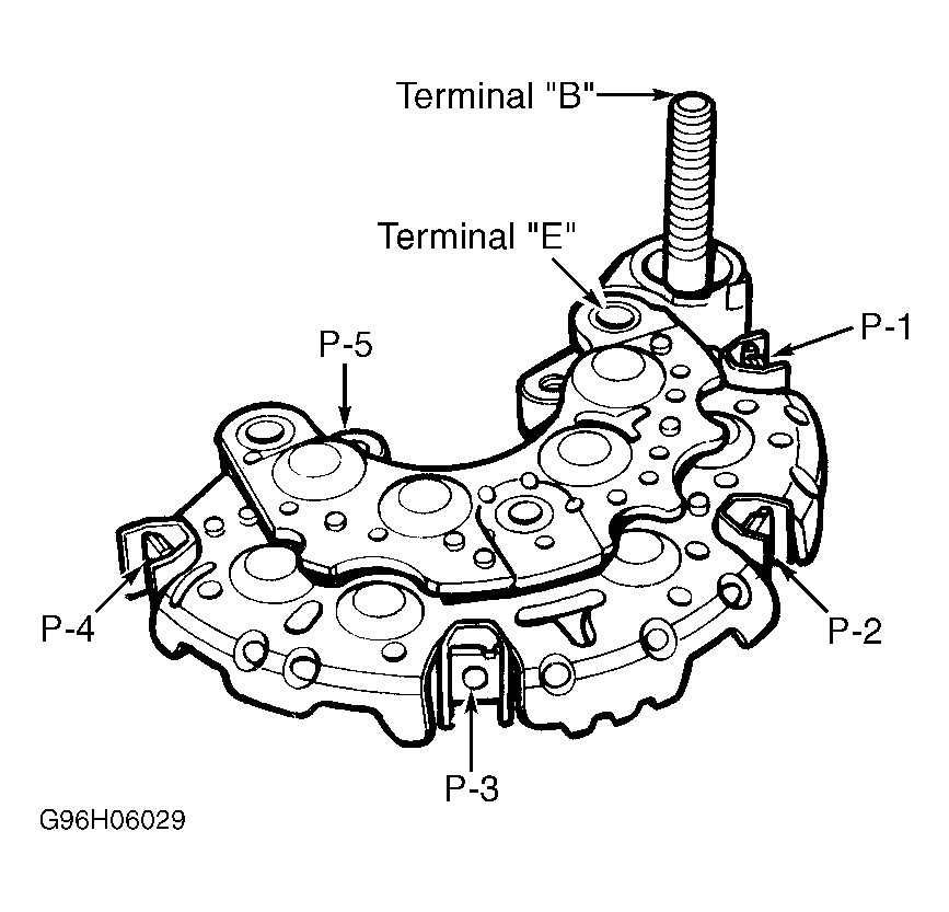 - Check for continuity between rectifier assembly terminal "B" and terminals P1-P5, and between terminals "E" and P1-P5. Refer to Fig 1. Note ohmmeter reading.