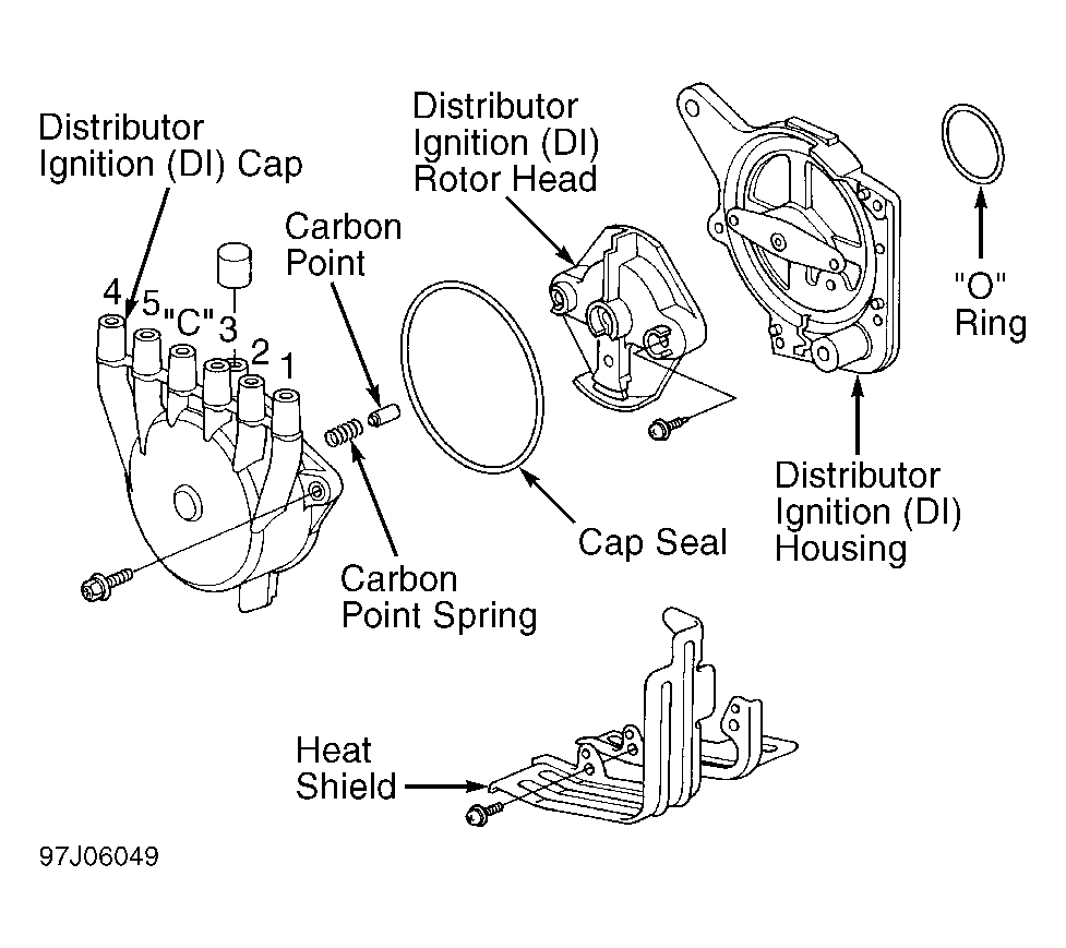 Note location of each spark plug wire. Disconnect wires from distributor cap. Remove hold-down bolts, distributor, heat shield and seal. Using clean engine oil, lubricate and install NEW "O" ring. See Fig 1. Ensure distributor and cylinder head mating surfaces are clean. Install distributor, aligning distributor coupling with slot in camshaft. Connect wiring. Tighten hold-down bolts. See TORQUE SPECIFICATIONS . Check ignition timing. See ignition timing procedures in ADJUSTMENTS article.