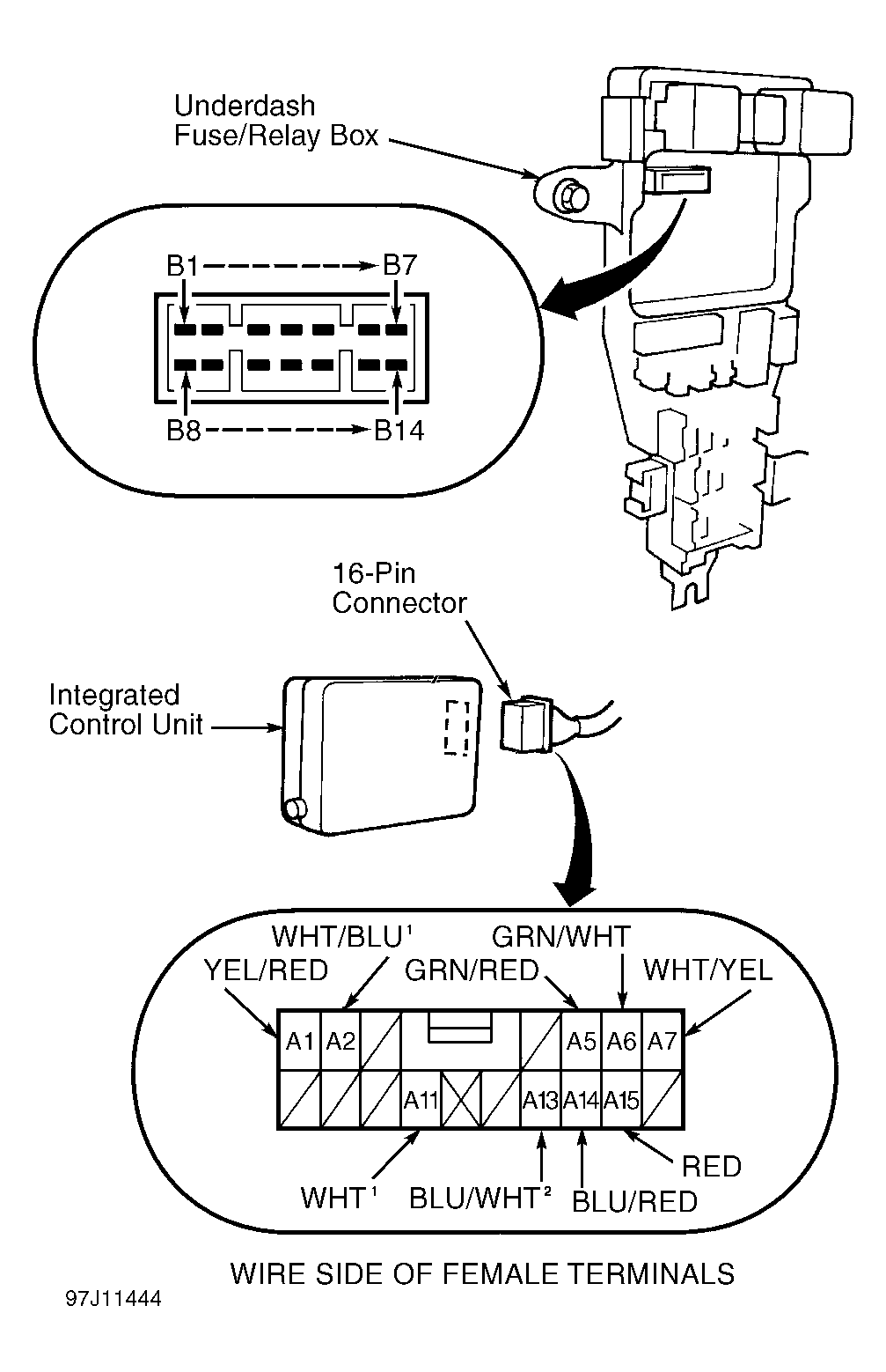 - Using a voltmeter, check for voltage between fuse/relay box 14-pin "B" socket terminal B12 and ground. If battery voltage exists, go to next step. If battery voltage does not exist, check fuse No. 37 (15-amp) located in underhood fuse/relay box. If fuse is okay, check for an open in White/Blue wire between fuse No. 37 and integrated control unit.