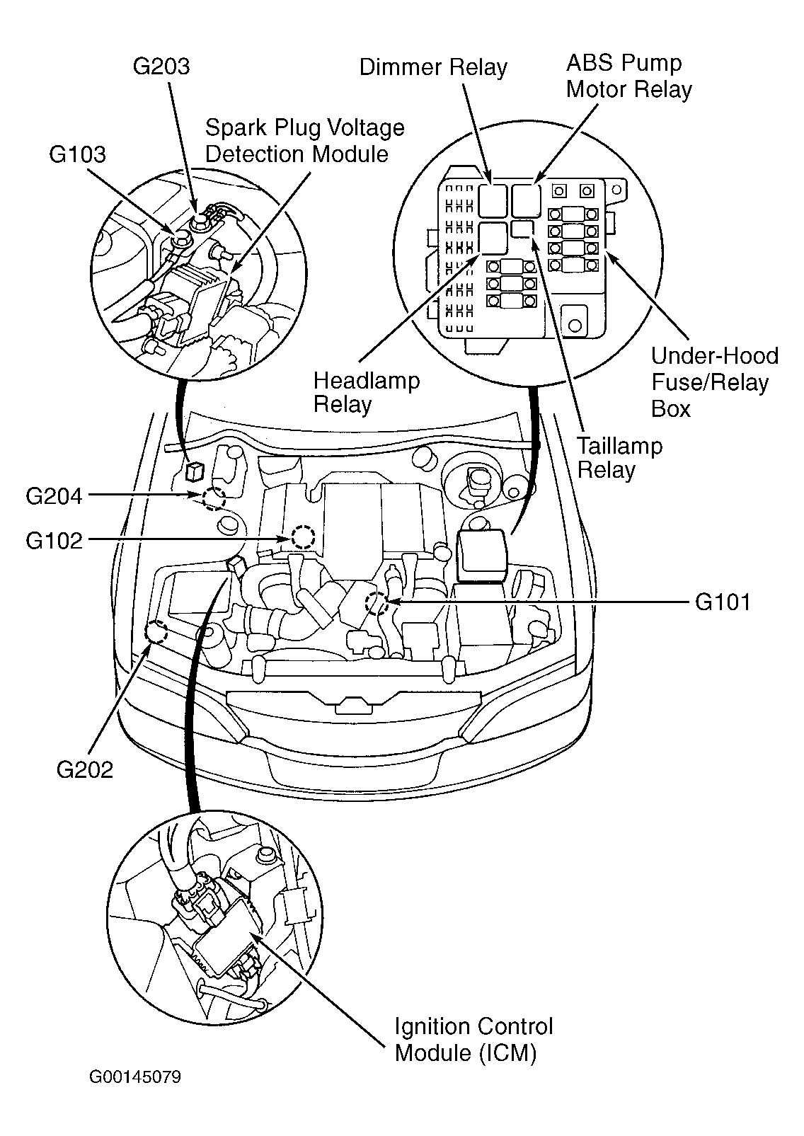 Spark Plug Voltage Detection Module On right rear corner of engine compartment. See Figure .