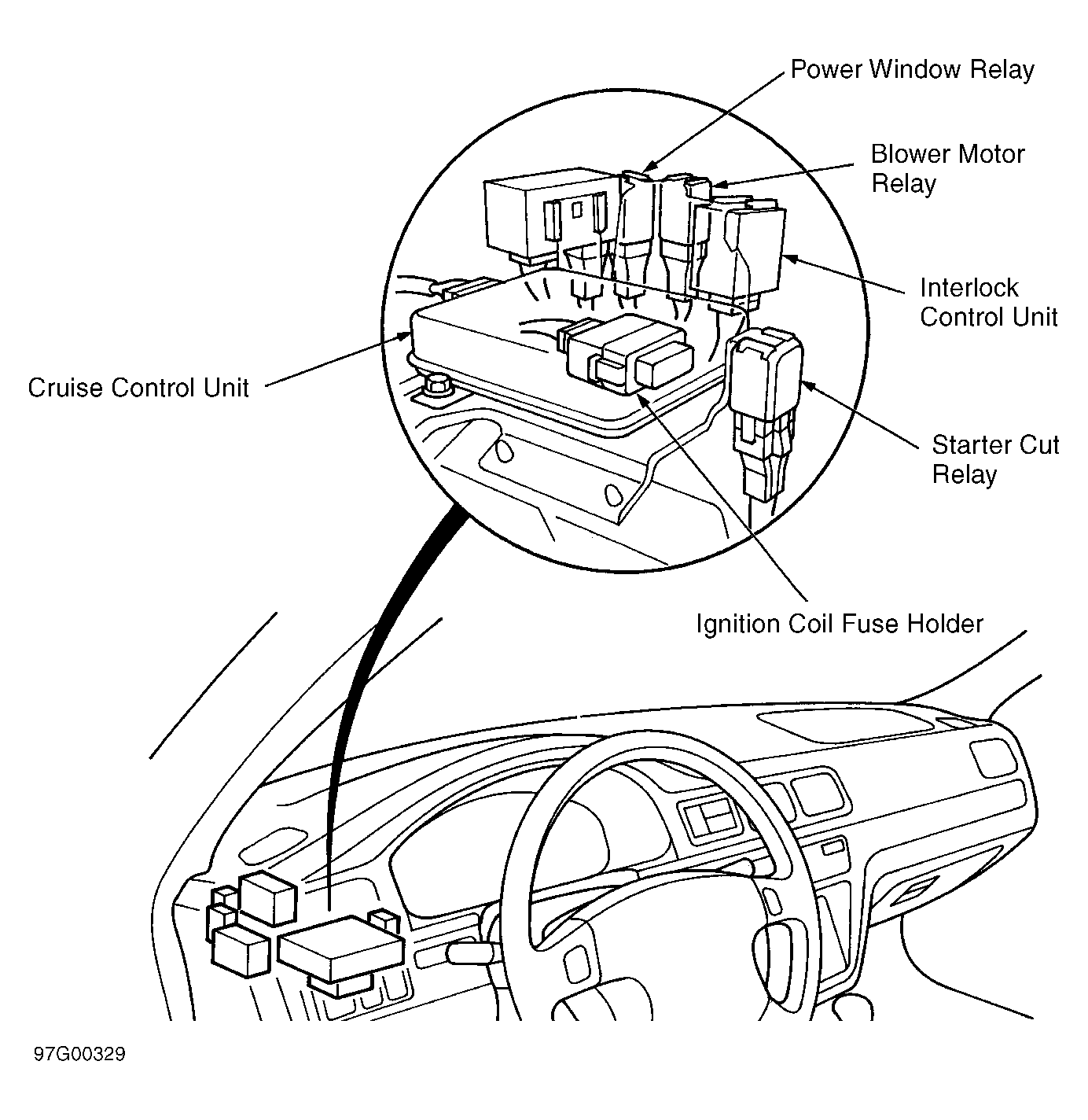Interlock Control Unit Behind dash, left of steering column, on bracket. See Figure .