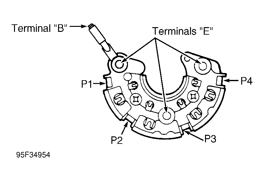 - Check for continuity between rectifier assembly terminal "B" and terminals P1-P4, and between terminals "E" and P1-P4. Refer to Fig 1 . Note ohmmeter reading.