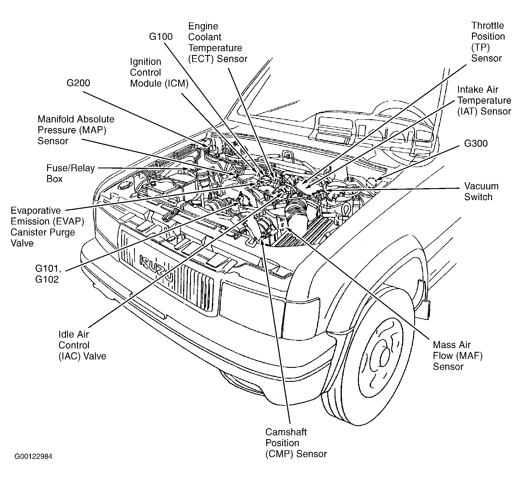 | Ignition Control Module (ICM) | Top rear center of intake manifold. See Figure . |