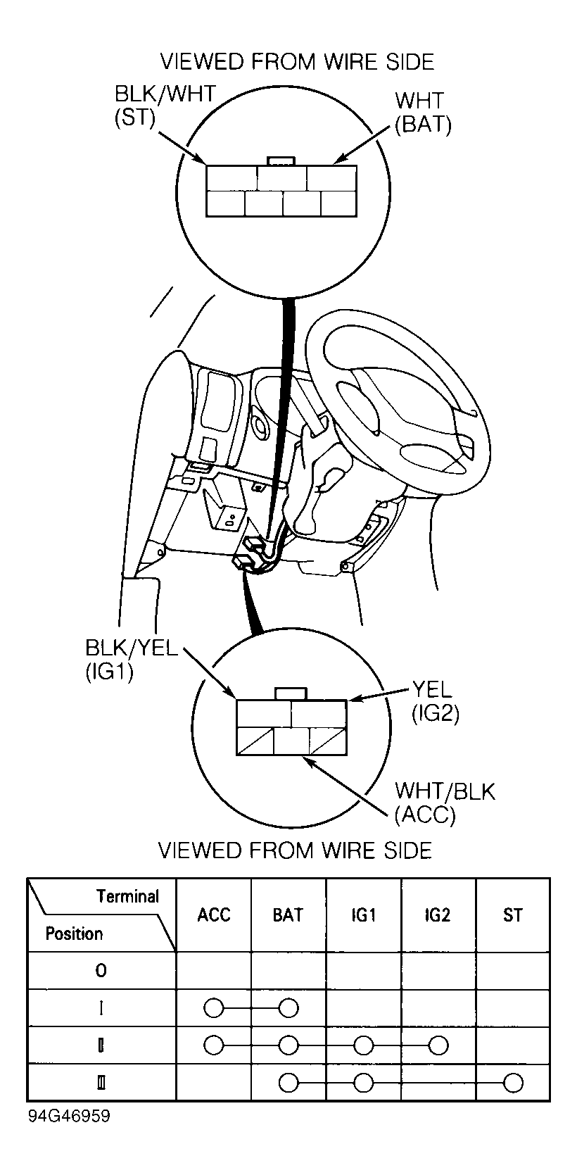 Remove dashboard lower cover and knee bolster. Disconnect main harness 7-pin connector. Use DVOM and check for continuity between main harness 7-pin connector terminals No. 2 and 4. See Figure . Continuity should be indicated with key in ignition switch. Continuity should not be indicated with key out of ignition switch. If continuity is not as indicated, replace ignition switch. See IGNITION SWITCH under REMOVAL & INSTALLATION.