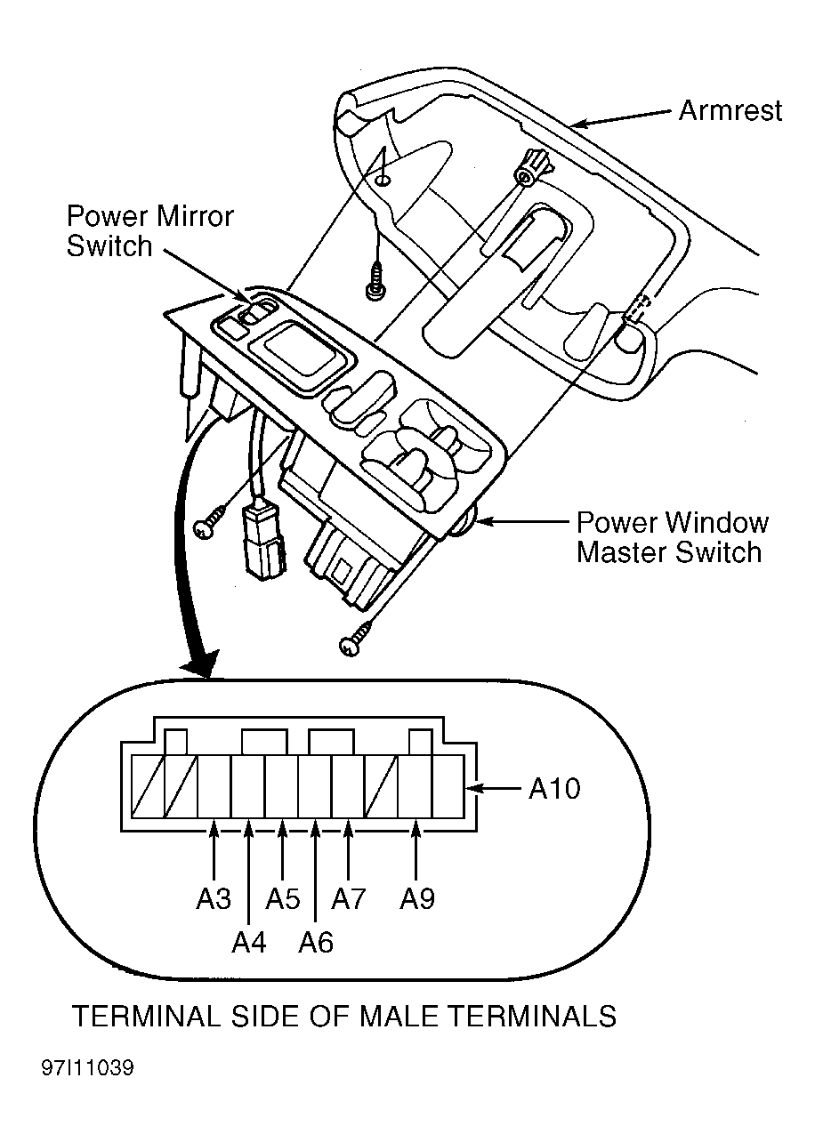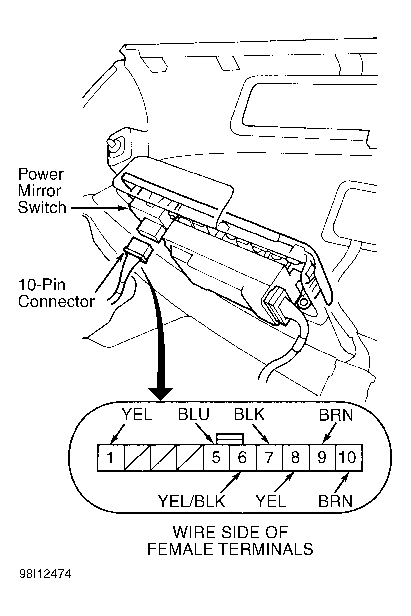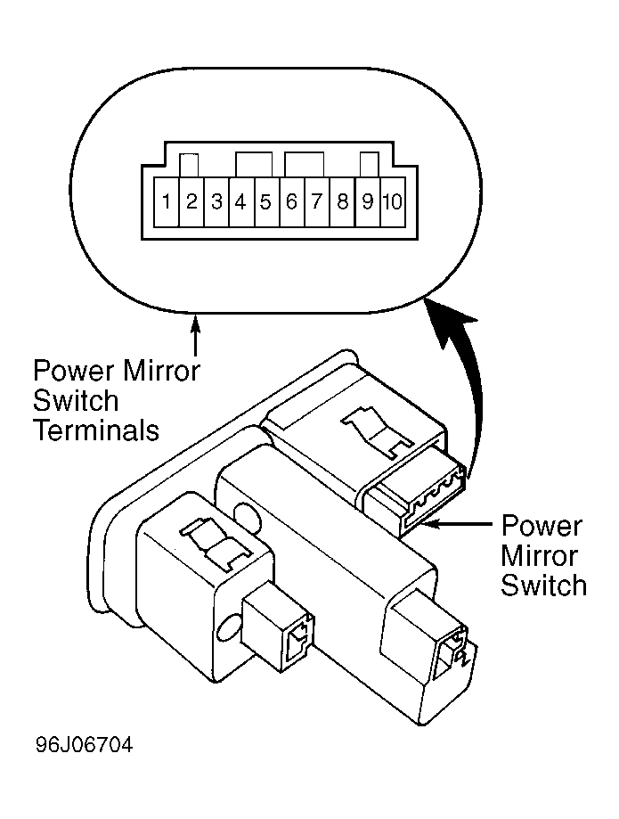 Remove power mirror switch. See POWER MIRROR SWITCH under REMOVAL & INSTALLATION. Using an ohmmeter, check continuity between specified switch terminals. See Figure, Figure, Figure or Figure . See appropriate POWER MIRROR SWITCH CONTINUITY TESTS specifications tables. If switch does not test as specified, replace faulty power mirror switch.
