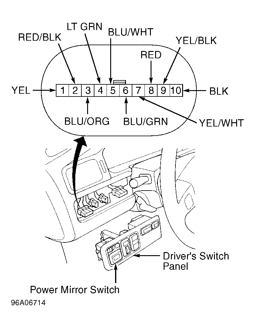 - Turn ignition off. Move jumper wire from 10-pin connector terminal No. 5 (Blue/White wire) to terminal No. 4 (Light Green wire). Turn ignition on. Left mirror should swing left. If mirror does not swing left, check for open in Light Green wire. If wire is okay, check left mirror motor. See POWER MIRROR MOTOR TEST under COMPONENT TESTS. If mirror does not tilt down and does not swing left, check for open in Yellow/White wire. If mirror operates correctly, check power mirror switch. See POWER MIRROR SWITCH TEST under COMPONENT TESTS.