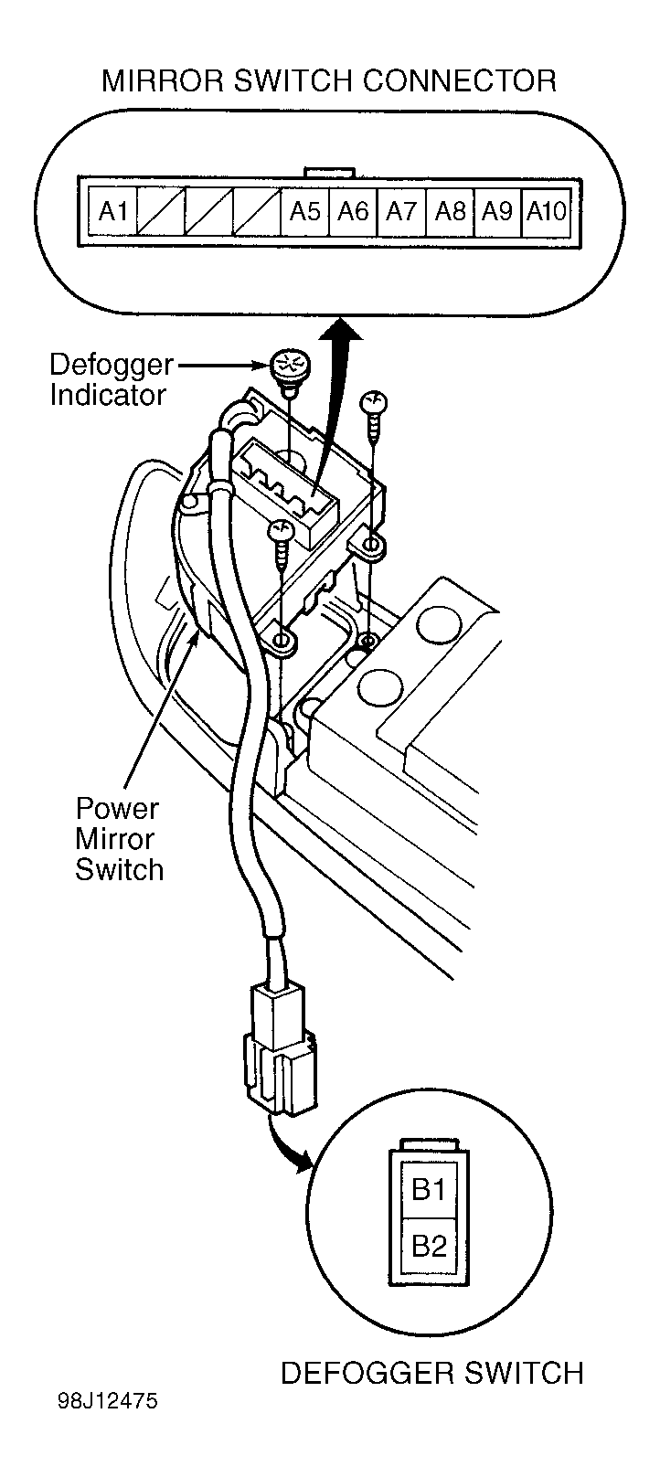 1. Connect a jumper wire between power mirror switch connector terminal No. 6 (Yellow/Black wire) and terminal No. 10 (Brown wire). See Figure. Connect a jumper wire between terminal No. 5 (Blue wire) and ground. Turn ignition on. Left mirror should tilt down. If mirror does not tilt down, check for open in Blue wire. If wire is okay, go to next step.