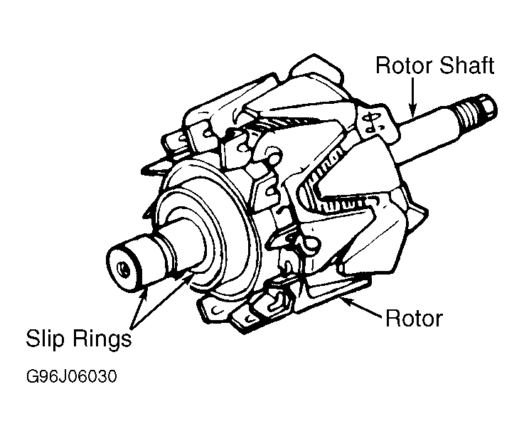 Ensure rotor bearings rotate smoothly. Using an ohmmeter, check continuity between slip rings and rotor, individually. Check continuity between the slip rings and the rotor shaft, individually. See Fig 1. If continuity exists, replace rotor. Check resistance between slip rings. Resistance should be 2.9 ohms. Replace rotor if resistance is not to specification.