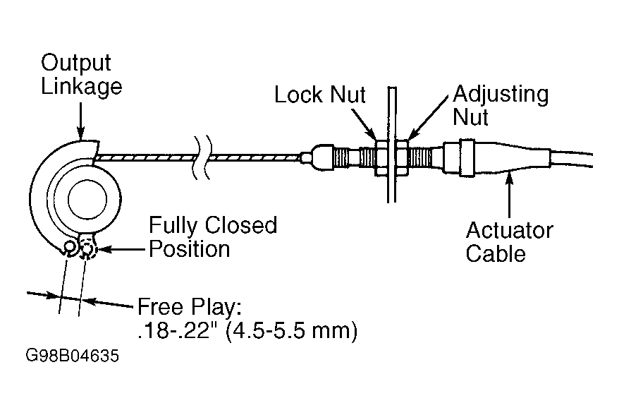 4. Check cruise control cable free play at throttle linkage. Cruise control cable is correctly adjusted when throttle linkage free play is 0.18-0.22" (4.5-5.5 mm) measured at cruise control cable end. See Figure.