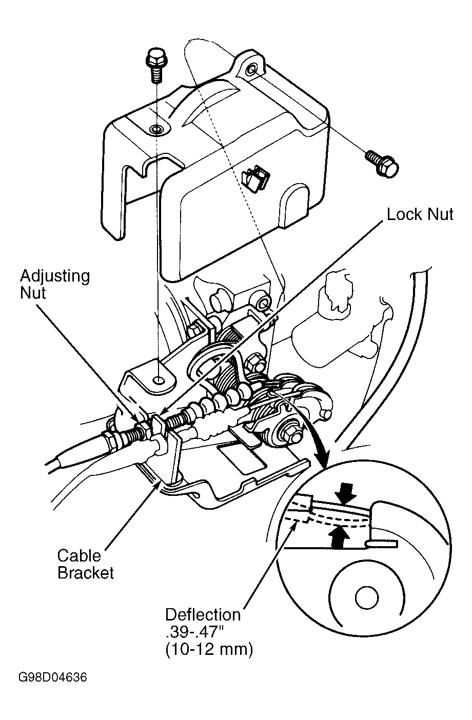 2. Turn throttle cable adjusting nut until it is.01" (3 mm) away from cable bracket. Tighten lock nut. Throttle cable deflection should be 0.39-0.47 (10-12 mm) when measured between throttle link and cable bracket. See Figure. If deflection is not as specified go to next step. If deflection is as specified, go to step 4).