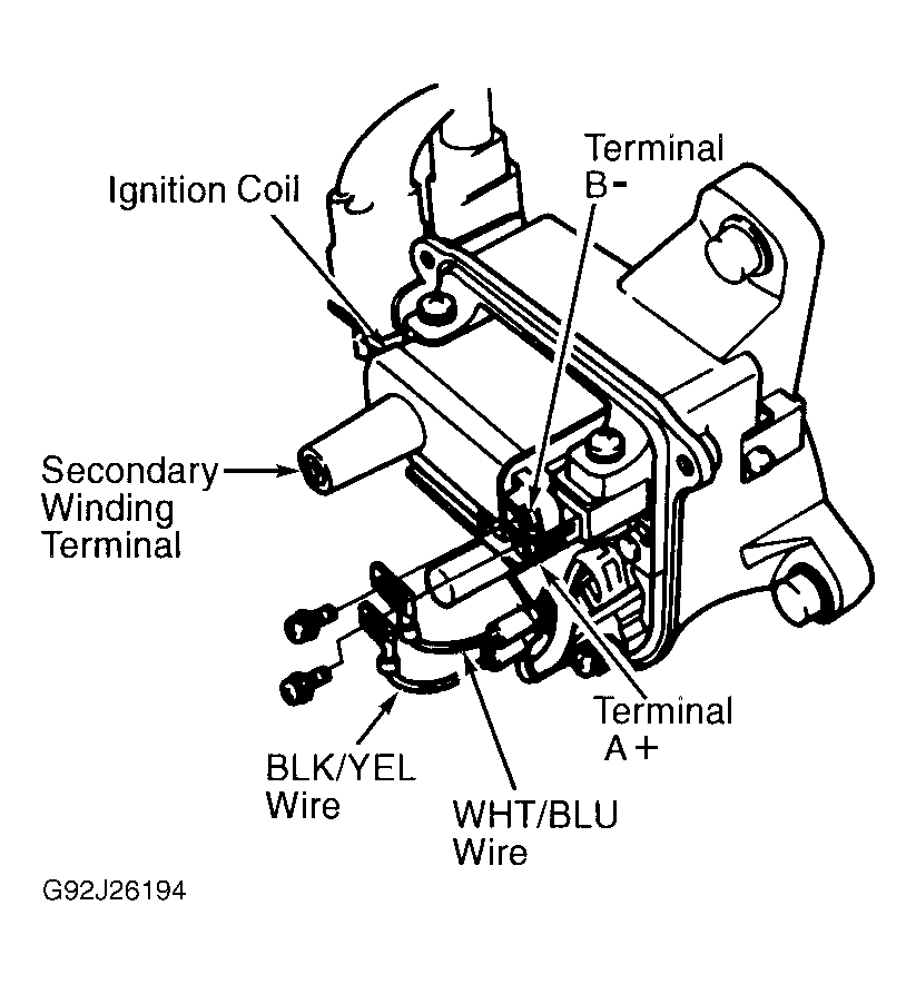 1. Turn ignition off. Remove distributor cap. Remove screws and disconnect Black/Yellow and White/Blue wires from coil. Measure primary winding resistance between primary terminals "A+" and "B-" on ignition coil. See Fig 1. Resistance should be .6-.8 ohm at 68°F (20°C).