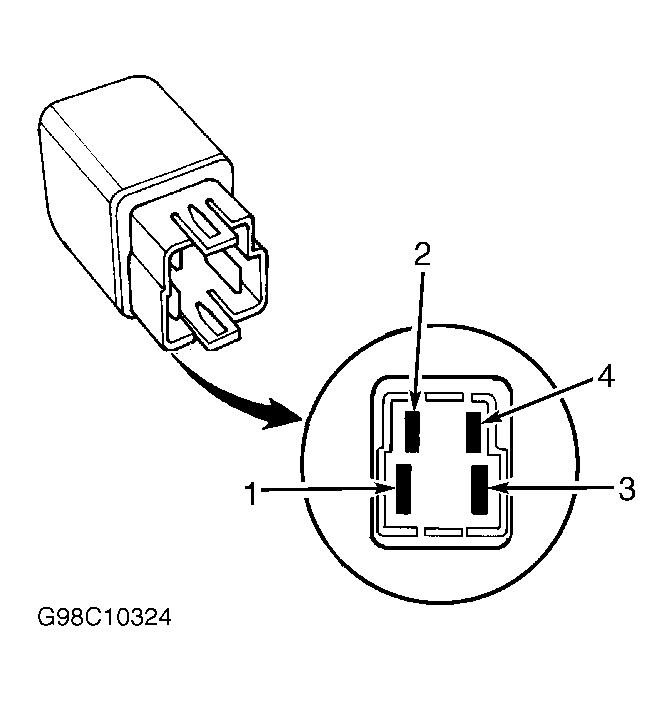 Remove relay from underhood fuse/relay block next to left strut tower. See Figure . With relay disconnected, use DVOM to check continuity between relay terminals No. and 3. See Fig 2 . Continuity should not exist. Apply battery voltage across terminals No. 2 and 4. Continuity should exist between terminals No. 1 and 3. If continuity is not as indicated, replace relay.