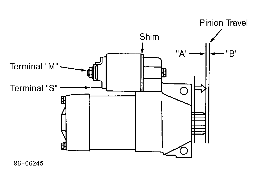 Disconnect terminal "M" wire from starter solenoid. Connect battery voltage to starter solenoid terminal "S". Ground terminal "M". With pinion gear fully extended, pull pinion gear out from starter and measure pinion travel between points "A" and "B". See Fig 1. If pinion travel is not to specification, add or remove shims between starter solenoid and gear housing cover as needed. See STARTER SPECIFICATIONS .