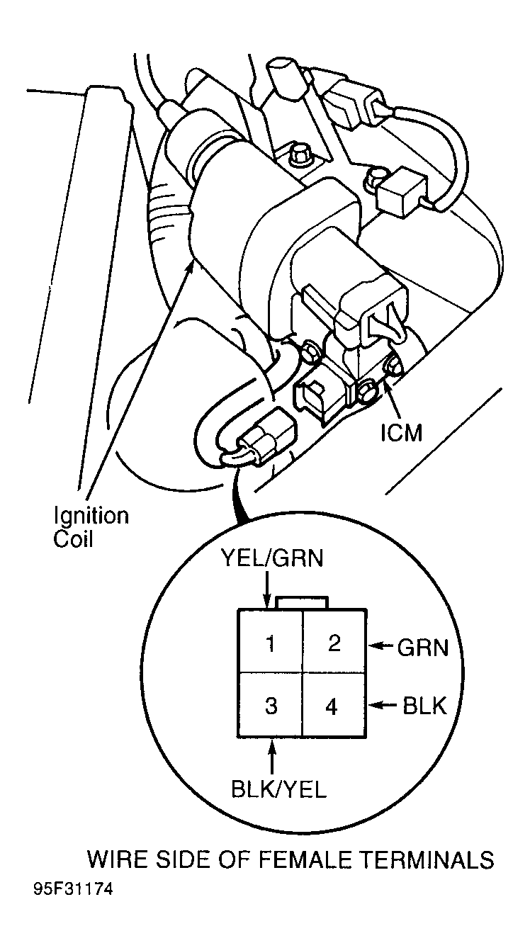 3. With ignition on, check for battery voltage between ICM 4-pin connector terminals No. 2 (Green wire) and No. 4 (Black wire). If battery voltage does not exist, check for an open in Green wire between ignition coil and ICM. Repair as necessary. If Green wire is okay, substitute a known-good ignition coil and recheck.