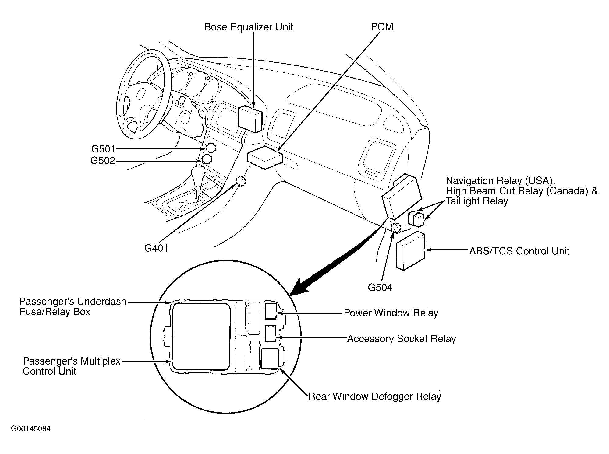 | Passenger's Multiplex Control Unit | On passenger's underdash fuse/relay box. See Figure . |