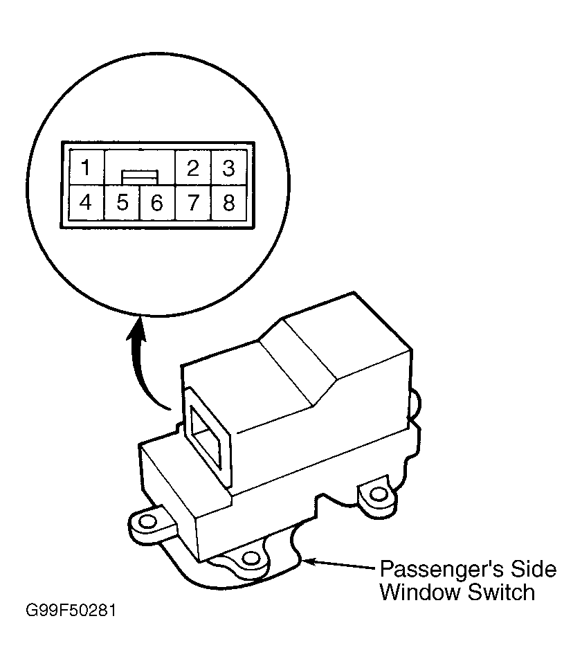 Remove passenger's door panel. See DOOR PANEL under REMOVAL & INSTALLATION. Remove passenger's power window switch from door panel. Disconnect 6-pin connector (3.2TL) or 8-pin connector (3.5RL) from switch. Check for continuity between specified switch terminals with switch in each specified position. See Fig 1 or Fig 2 . See PASSENGER'S POWER WINDOW SWITCH table. If continuity is not as specified, replace passenger's power window switch.