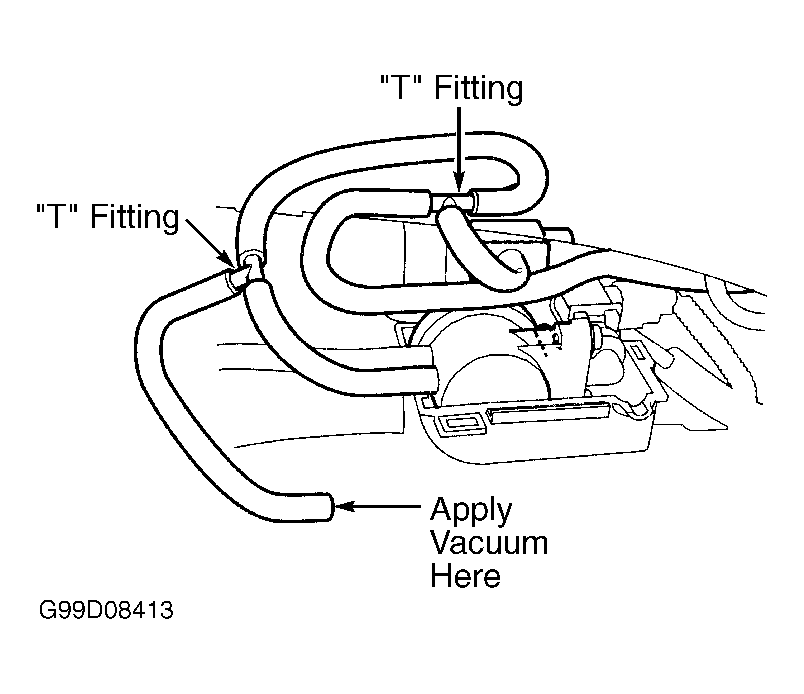 - Remove fuel filler cap. Remove vapor hose from EVAP 2-way valve. Connect "T" fitting to disconnected hose. Connect vacuum pump to one "T" fitting port and vacuum gauge to other "T" fitting port. See Fig 5. Apply vacuum slowly and continuously while observing gauge. If vacuum stabilizes momentarily at .2-.6 in. Hg, go to next step. If vacuum does not stabilize momentarily at .2-.6 in. Hg, replace valve.