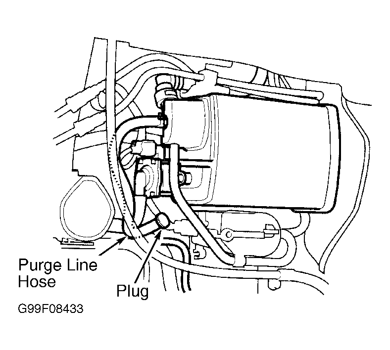 - Turn ignition off. Disconnect purge line hose from canister at metal line. Plug disconnected hose. See Fig 4. Turn ignition on. Measure voltage between PCM 32-pin connector terminal No. 29 (Light Green wire) and PCM 31-pin connector terminal No. 18 (Green/Yellow wire) while slowly pumping vacuum pump. Continue to pump vacuum until voltage drops to about 1.5 volts. Ensure engine coolant temperature is greater than 95°F (35C°) and vacuum pump has no leak. Monitor voltage for 20 seconds. If voltage drops to 1.5 volts and holds for at least 20 seconds, check EVAP purge control solenoid valve and connections. Repair as necessary. If EVAP purge control valve and connections are okay, go to next step. If voltage does not drop to 1.5 volts and hold for at least 20 seconds, check EVAP control canister vent shut valve and "O" ring for leakage. If EVAP control canister vent shut valve and "O" ring are okay, replace EVAP control canister.