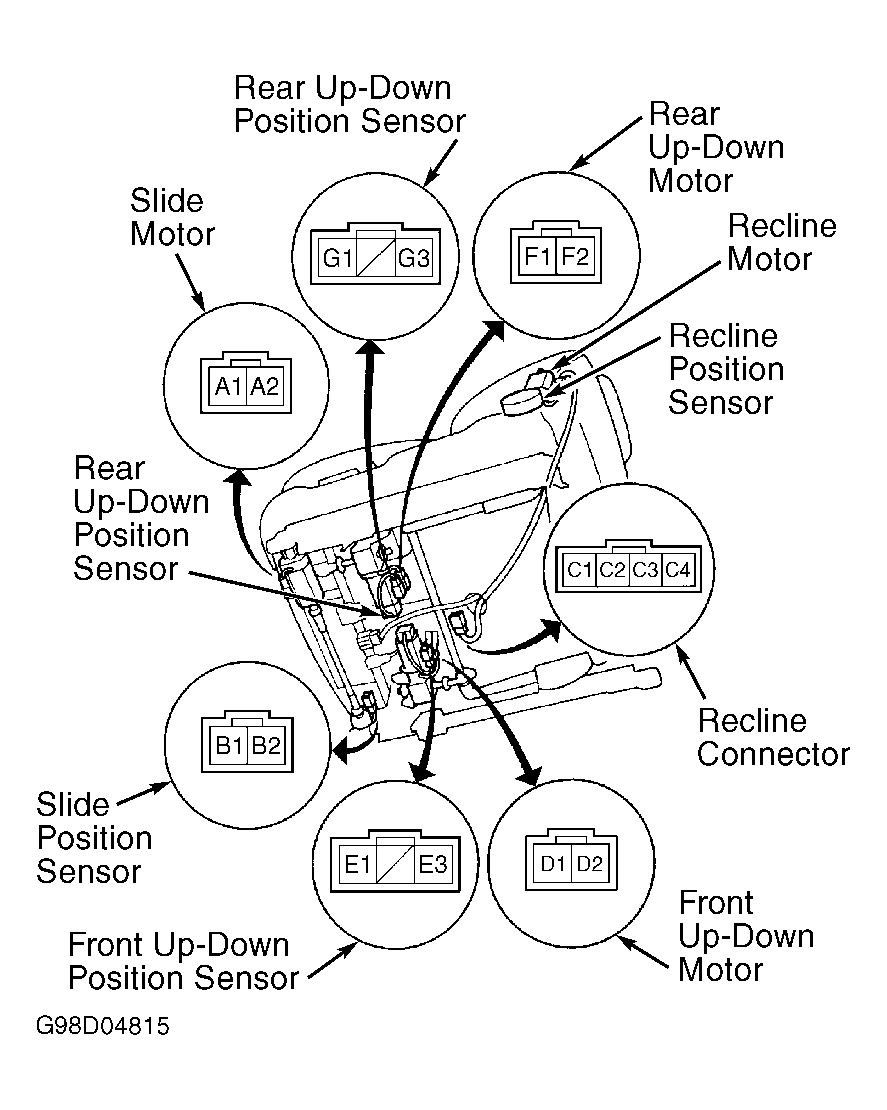 Remove driver's seat. See FRONT SEAT under REMOVAL & INSTALLATION. Disconnect all power seat motors and sensors. See Figure . Connect battery power across motor leads. Using an analog ohmmeter, observe resistance across associated sensor terminals. See DRIVER'S POWER SEAT POSITION SENSOR table. Needle on ohmmeter should move from left to right. If motor does not run, reverse battery power terminals. If motor still does not run, replace faulty motor. If ohmmeter needle does not move from left to right, replace faulty sensor. Repeat this procedure for each motor-sensor combination.