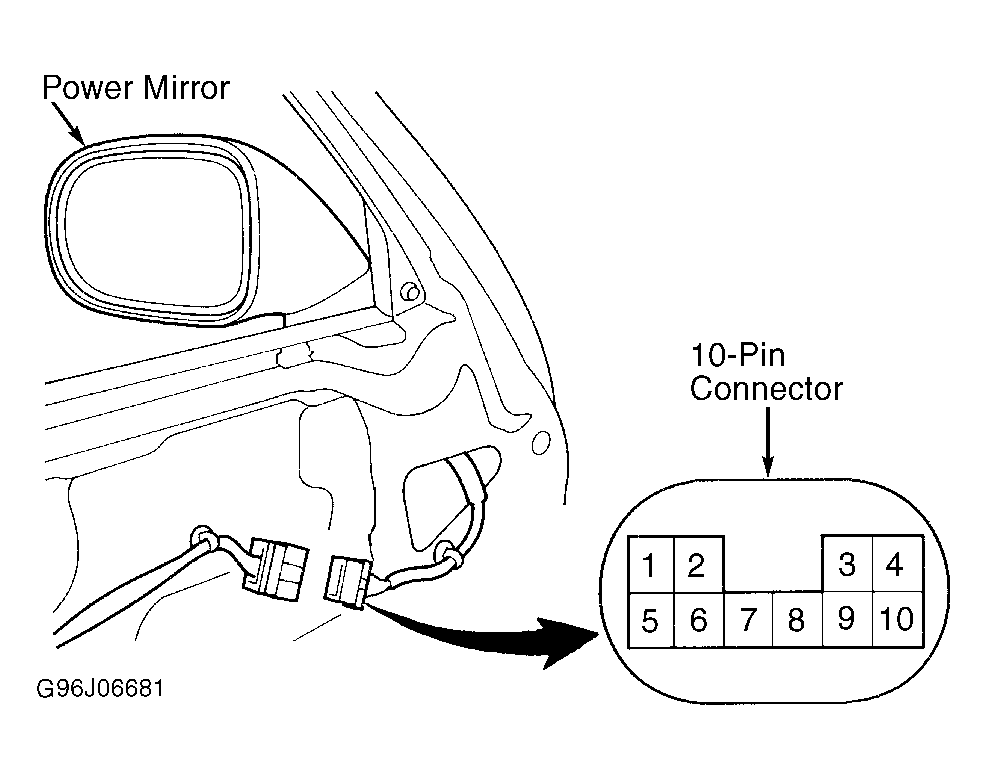 Remove door panel. See DOOR PANEL under REMOVAL & INSTALLATION. Disconnect power mirror 10-pin connector. See Fig 1 . Connect battery power to power mirror as specified in POWER MIRROR table. If power mirror fails to function as specified, replace faulty power mirror. See POWER MIRROR under REMOVAL & INSTALLATION.