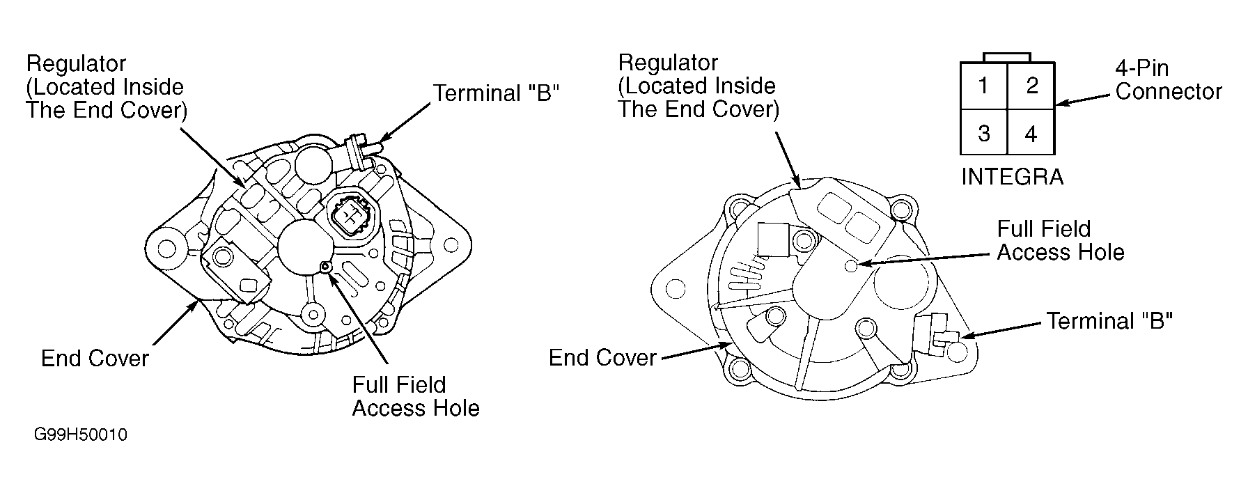 - With engine speed still at 2000 RPM, full field generator. Insert test probe into full field access hole, located on back of generator. See Figure . If 70 amps or more exist, replace internal IC voltage regulator. If less than specified amperage exists, test and repair generator components. See BENCH TESTING .