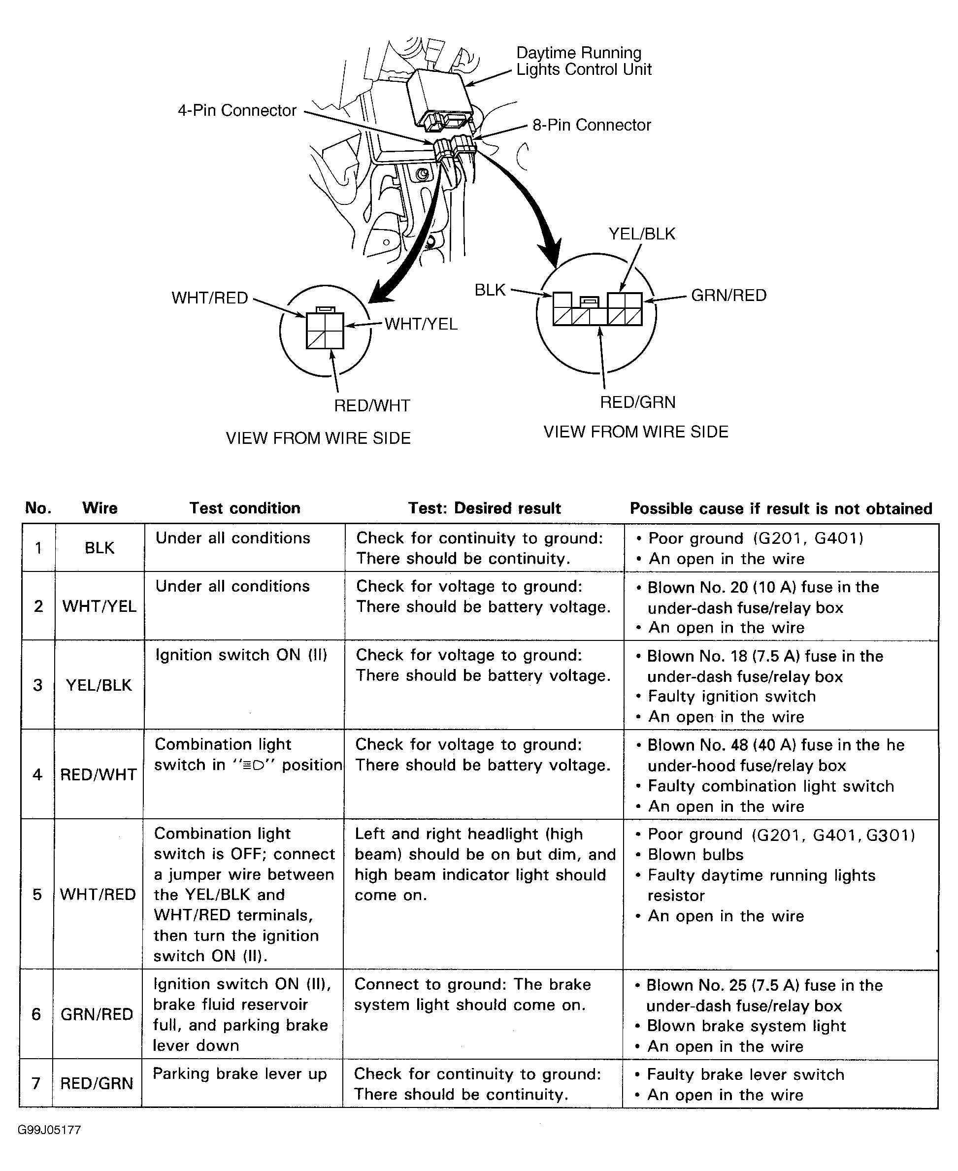 Remove dashboard lower cover and knee bolster. Daytime Running Lights (DRL) control unit is located on driver's side of vehicle near "A" pillar. Disconnect DRL control unit 4 and 8-pin connectors. Check connectors for damage or loose/corroded terminals, repair as necessary. Test each circuit of DRL unit connector for continuity or voltage as indicated. See Fig 1 . Repair as necessary. If all input tests are as specified, replace DRL control unit.