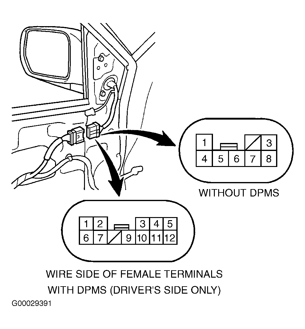 Remove appropriate door panel. See DOOR PANEL  under REMOVAL & INSTALLATION. Disconnect power mirror harness connector. See Figure. Using DVOM, check for continuity between following mirror connector terminals: