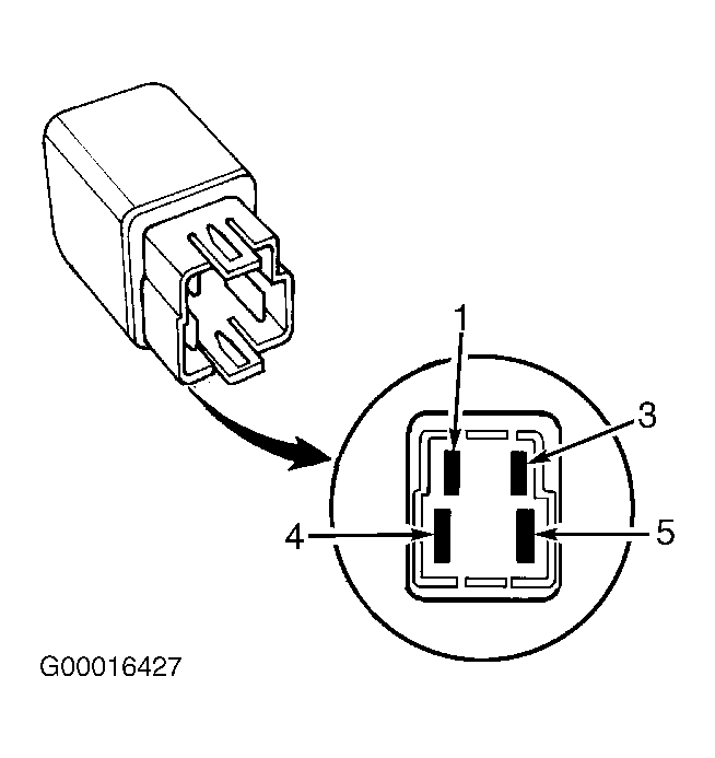 With relay disconnected, use DVOM to check continuity between relay terminals No. 4 and 5. See Fig 1. Continuity should not exist. Apply battery voltage across terminals No. 1 and 3. Continuity should exist between terminals No. 4 and 5. If continuity is not as indicated, replace relay.