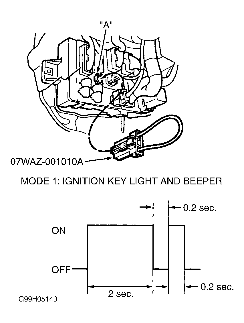 NOTE: To enter self-diagnostic MODE 2, vehicle must already be in self-diagnostic MODE 1. To cancel MODE 2, remove SCS service connector for at least 10 seconds or turn ignition off. - Activate MODE 2 diagnostics. To switch from MODE 1 to MODE 2, disconnect SCS Service Connector (07WAZ-0010100) for about 10 seconds, then reconnect SCS service connector. Ignition key light and beeper should come on for 2 seconds, then turn off and back on twice more at .2 second intervals. This confirms that system has gone from MODE 1 to MODE 2. Go to next step.