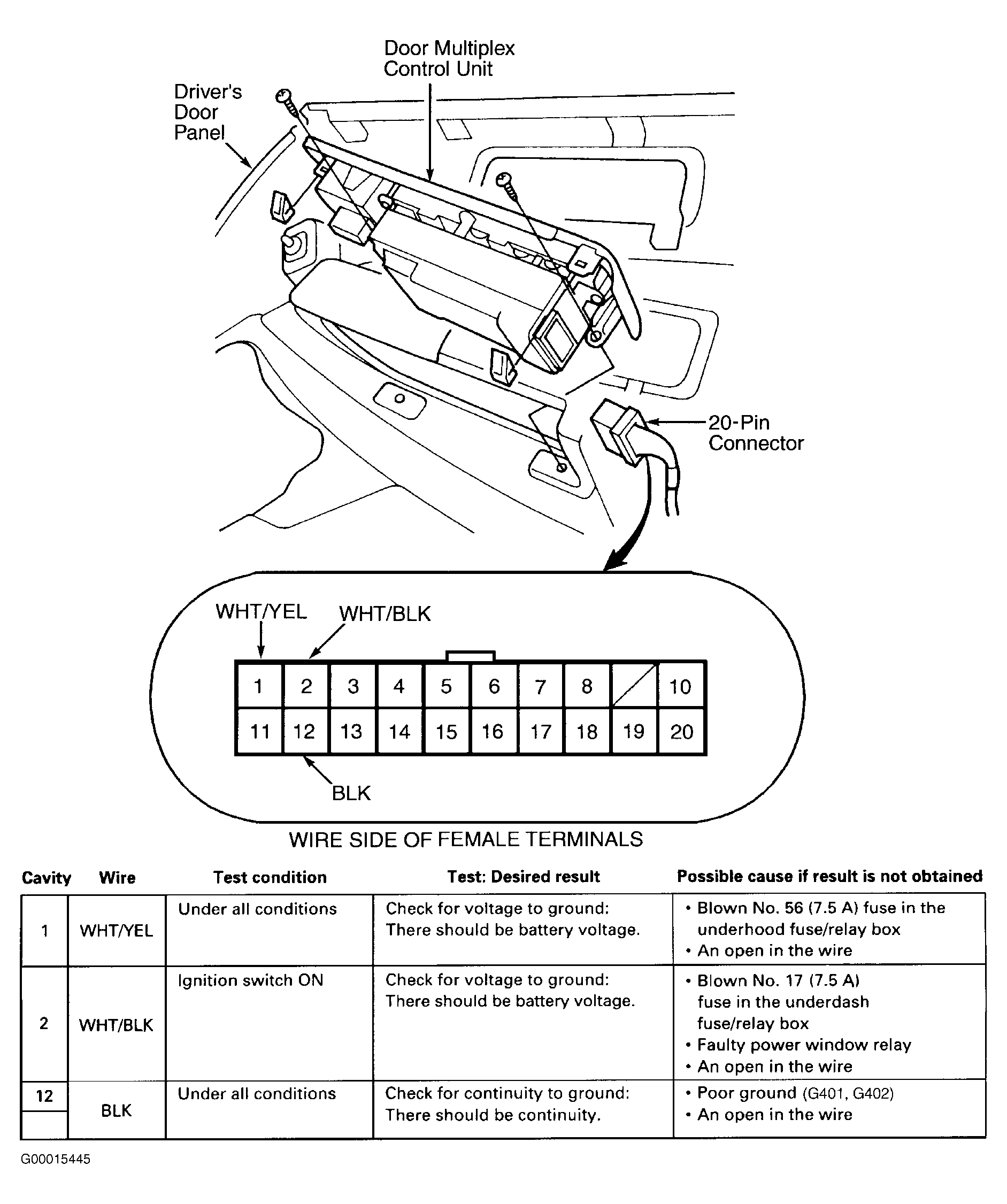 Turn ignition off. Remove driver's door panel. See DOOR PANEL under REMOVAL & INSTALLATION. Disconnect door multiplex control unit connector. Inspect connector and terminals. Check for bent, loose or corroded terminals. Repair connector terminals as necessary and retest system. Perform door multiplex control unit input tests. See Fig 1 . Repair as necessary and recheck system operation. If input tests are okay, replace power window master switch (door multiplex control unit).