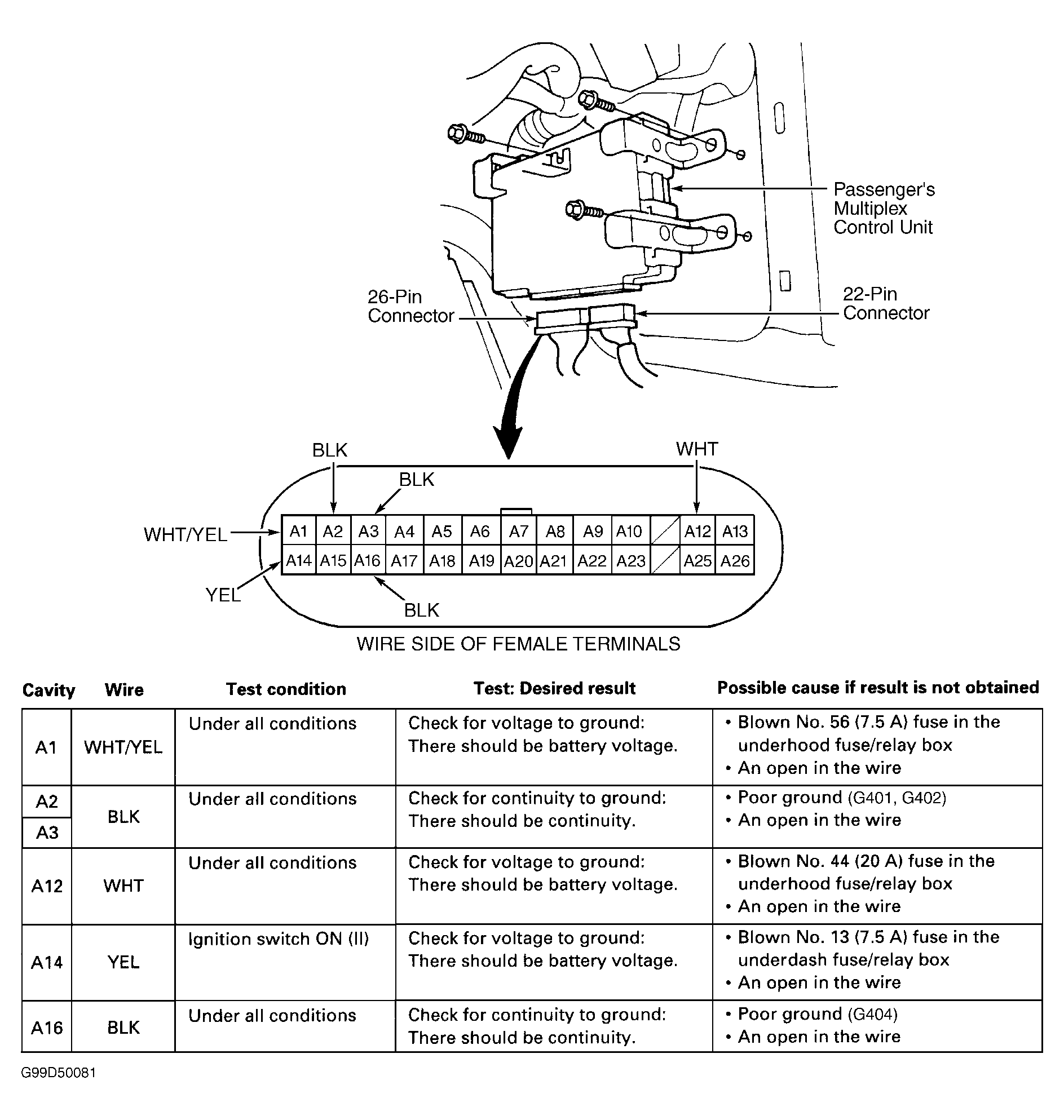 - Remove passenger's multiplex control unit. Passenger's multiplex control unit is located behind right kick panel. Disconnect passenger's multiplex control unit 22-pin connector "B". Remove driver's underdash fuse/relay box located under instrument panel. See DRIVER'S UNDERDASH FUSE/RELAY BOX under REMOVAL & INSTALLATION. Disconnect driver's multiplex control unit from underdash fuse/relay box. Disconnect driver's multiplex control unit 14-pin connector "A". Go to next step.