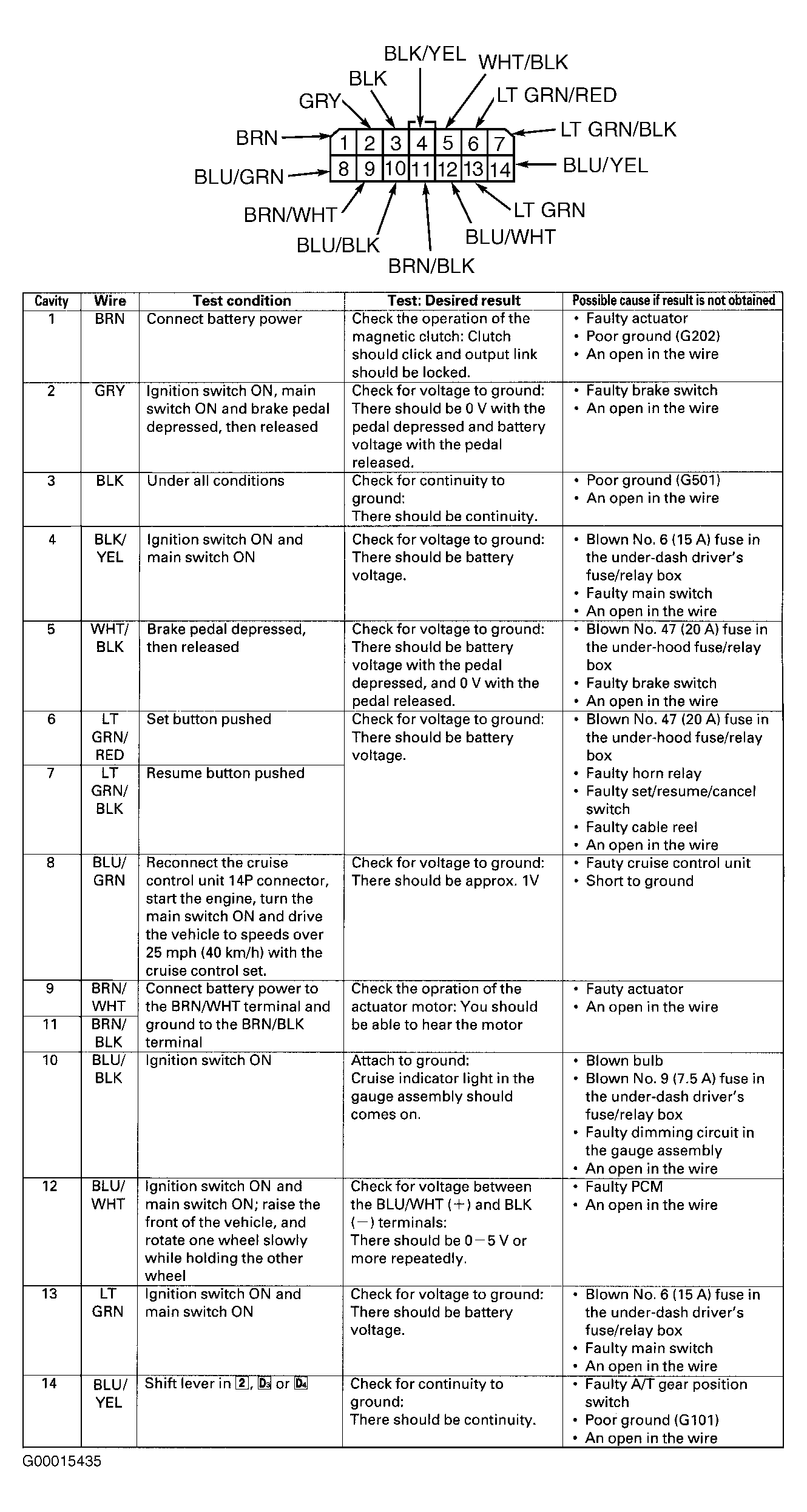 - Disconnect cruise control unit 14-pin connector. Ensure connector and terminals are okay. Repair as necessary and retest system. If connector and terminals are okay, perform cruise control unit input tests. See Fig 1. If an input test indicates a problem, find and correct cause and retest system. If all input test results are okay, replace cruise control unit.