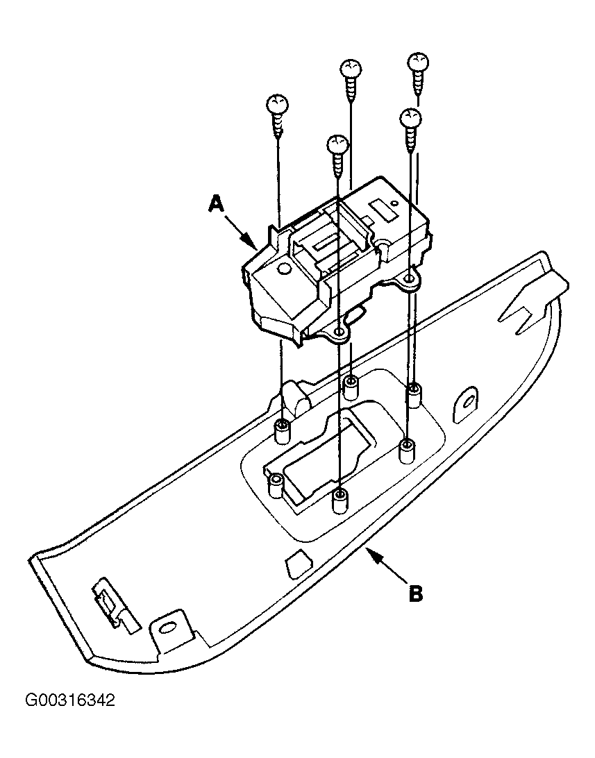 Remove passenger's door panel. See DOOR PANEL under REMOVAL & INSTALLATION. Remove the screws and the passenger's switch assembly. See Fig 1 . Remove the five mounting screws. Remove the passenger's switch (A) from the panel (B). See Fig 2 . Check for continuity between the terminals in each switch position. See Fig 3 . See PASSENGER'S POWER WINDOW SWITCH table.