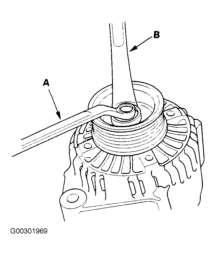 - If the front bearing needs replacing, remove the pulley locknut with a 10-mm wrench "A" and a 22-mm wrench "B". If necessary, use an impact wrench. See Fig 2.