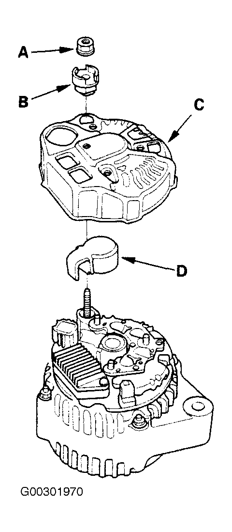 - Remove the washer nut "A" and insulator "B" from the "B" terminal. Remove the end cover "C" and dust seal "D". See Fig 4.