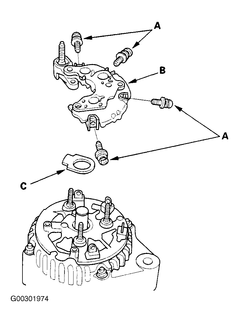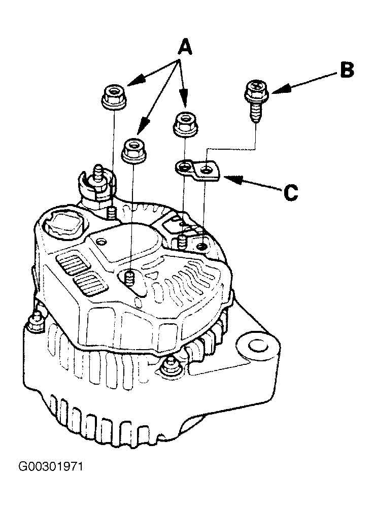 - Remove the three flange nuts "A" and the screw "B" from the alternator, then remove the plate terminal "C". See Fig 3.