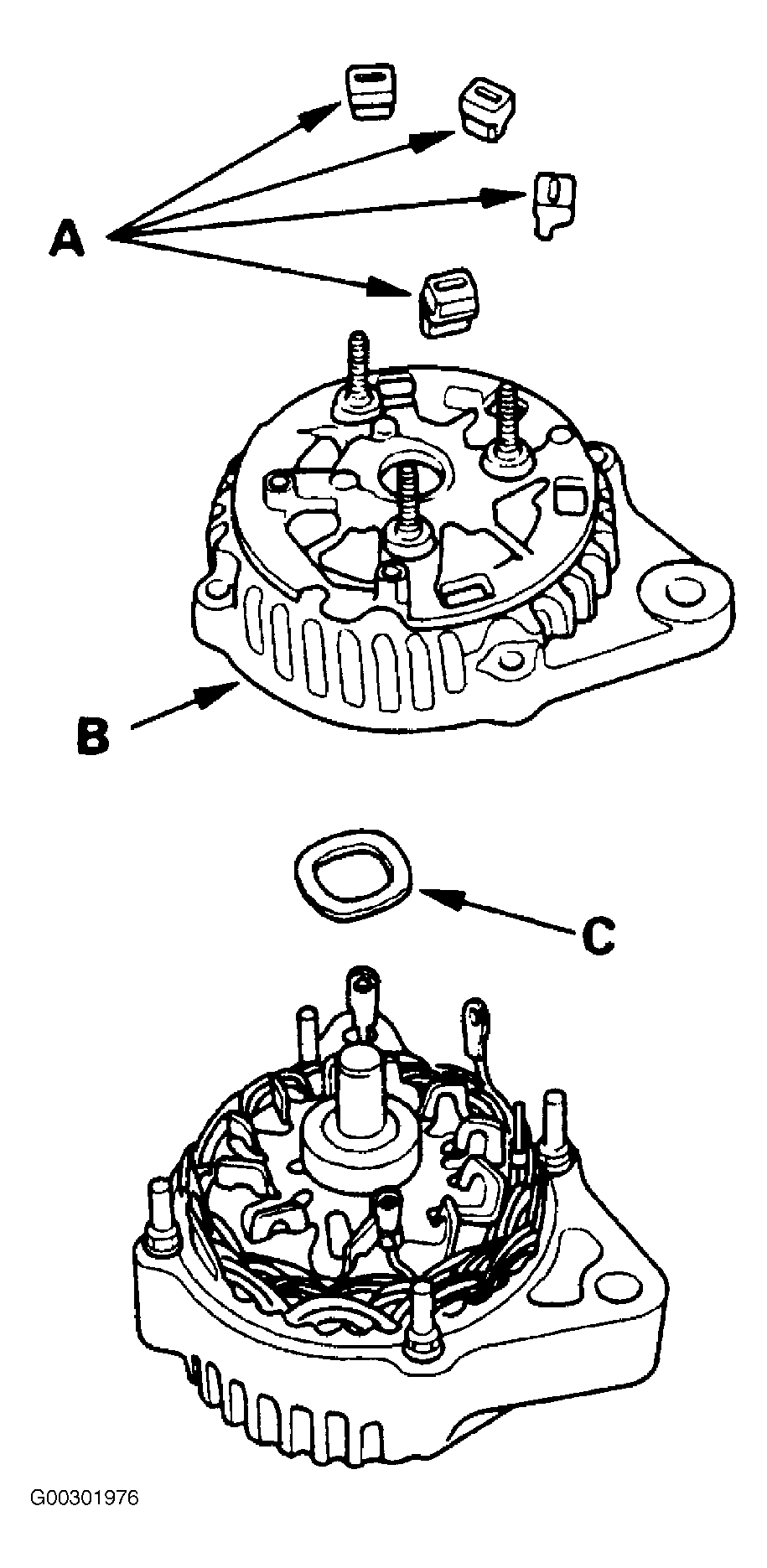 - Remove the 4 insulators "A" rear housing "B" and washer "C". See Fig 9.