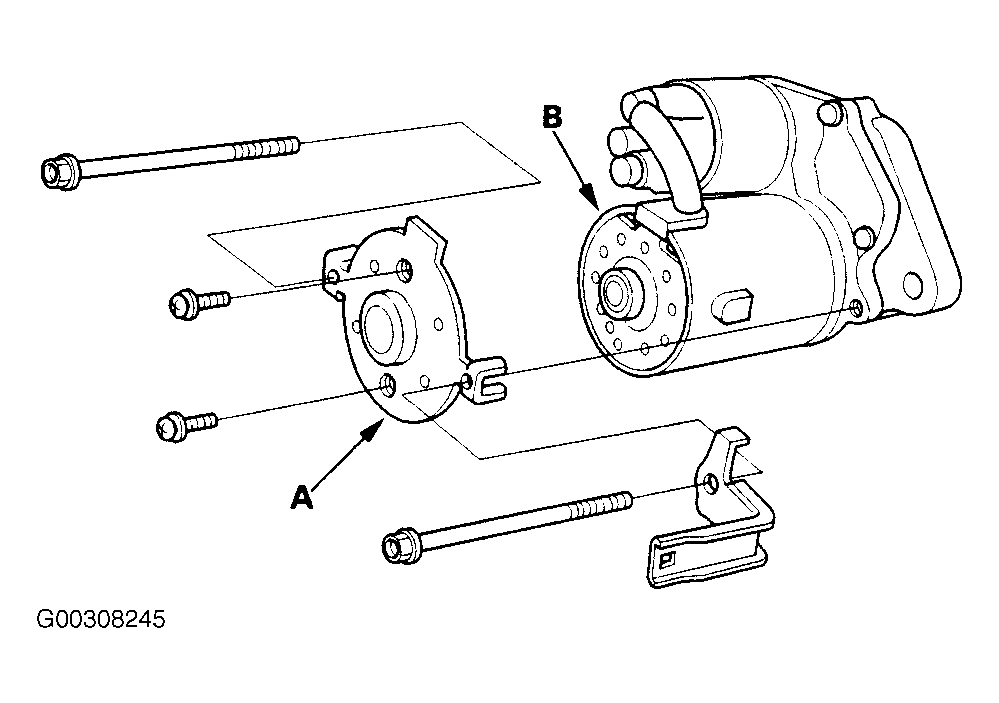 - Install the starter and cover (A) to retain the brush holder (B). See Fig 4 .