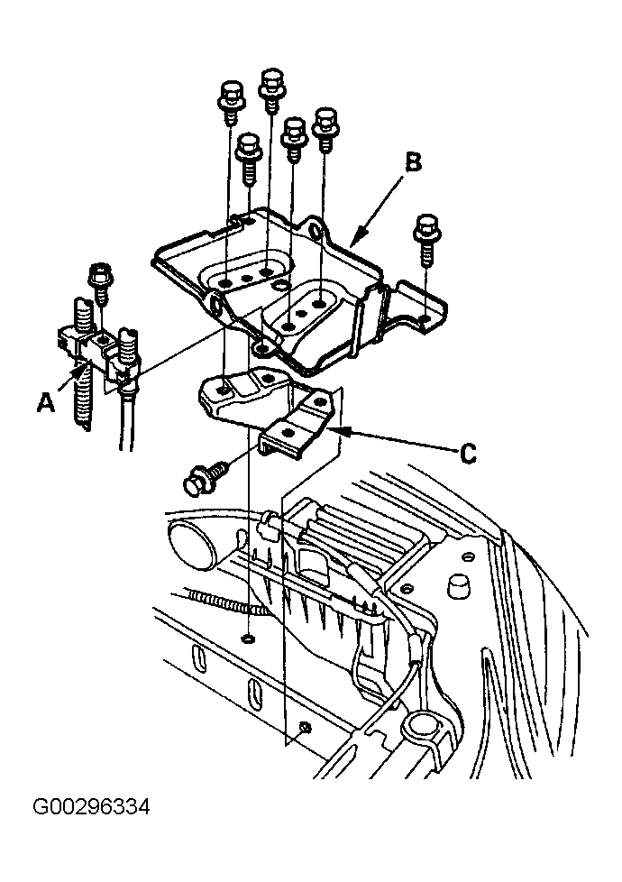 - Install the battery base bracket (A), then install the battery base (B) and harness clamp (C). See Figure.
