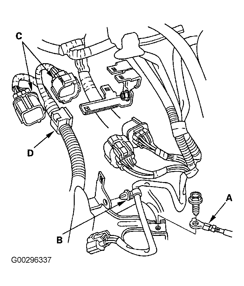 - Install the ground cable (A) and harness clamps (B). See Figure. Connect the engine wire harness connector (C).