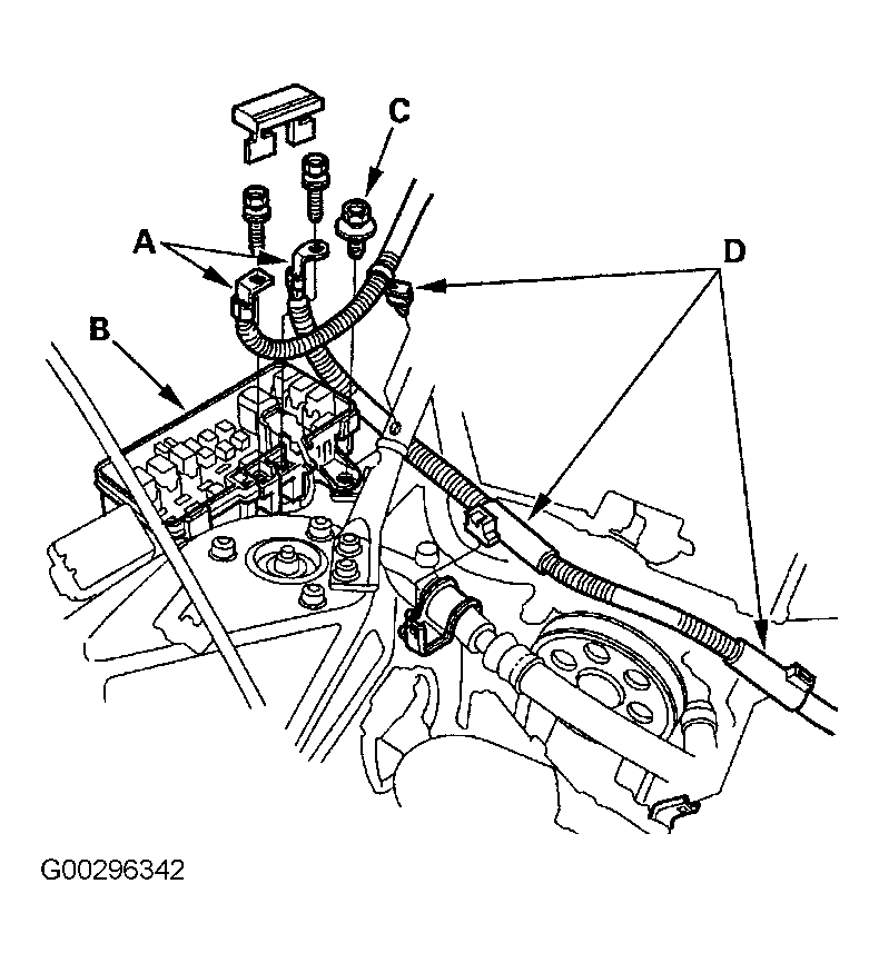 - Install the battery cable (C) on the under-hood fuse relay box. Install the harness clamps (D). Install the battery cable grommet (E).