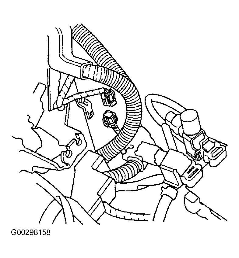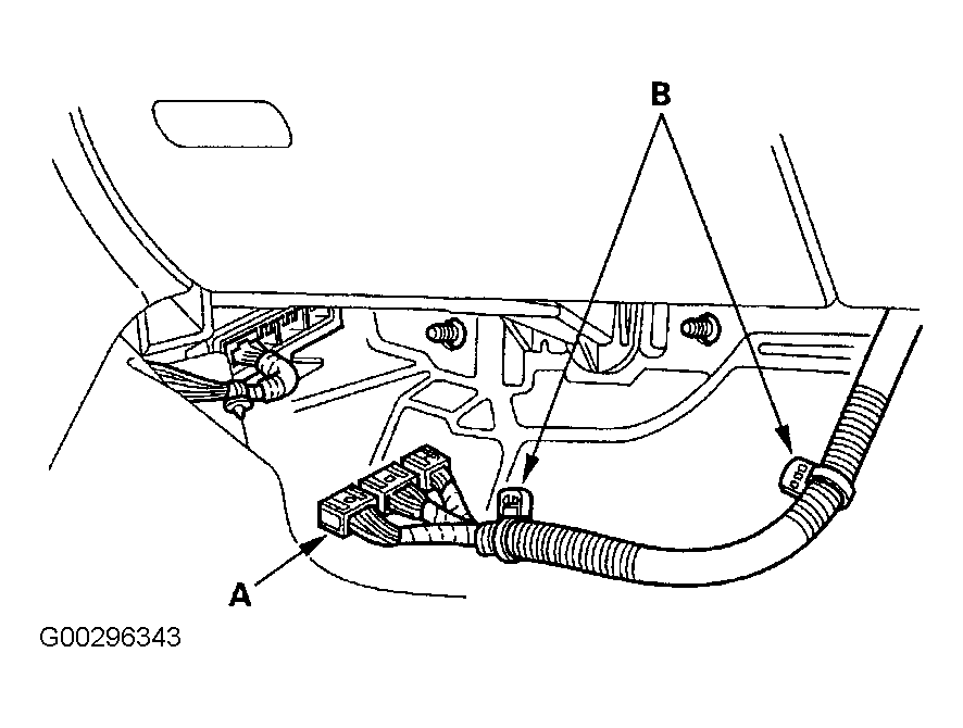 - Connect the ECM/PCM connector (A), and install the harness clamps (B). See Figure.