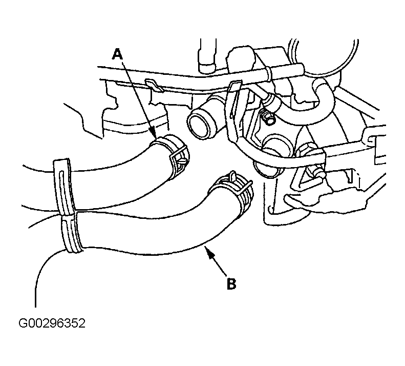 - Install the upper radiator hose (A) and lower radiator hose (B). See Figure.