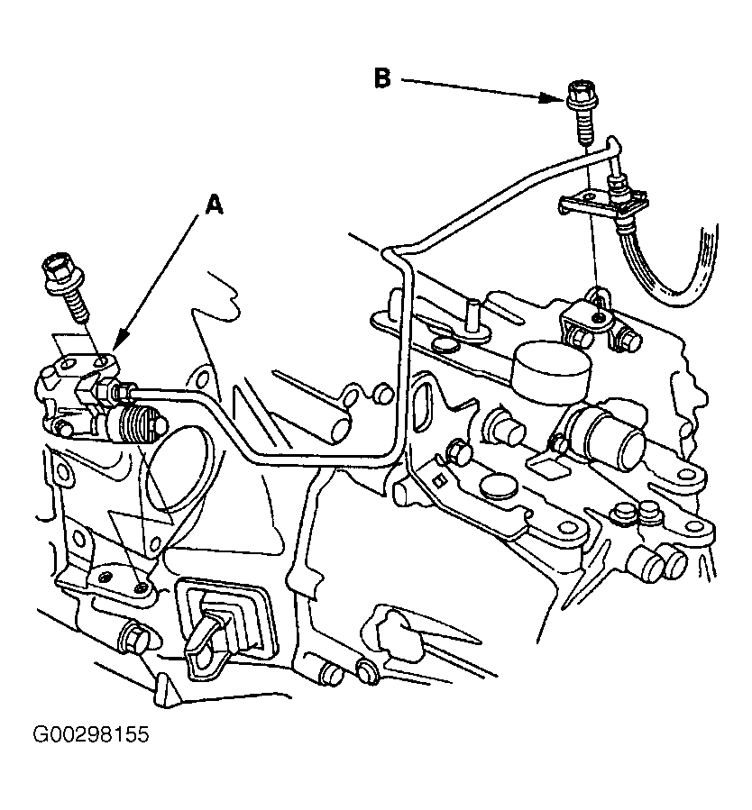 - Install the clutch slave cylinder (A) and clutch line bracket mounting bolt (B) (M/T). See Figure.