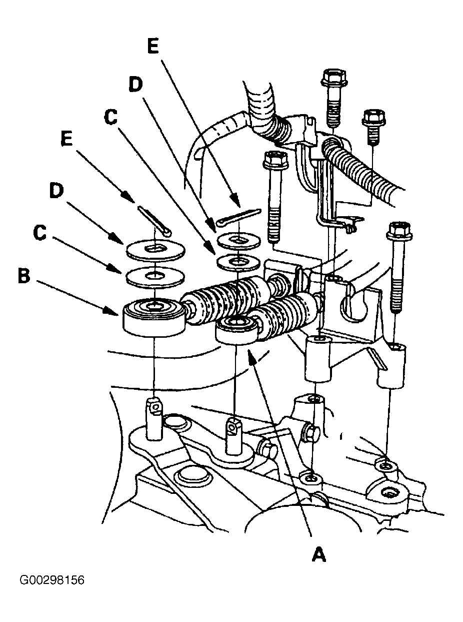 - Install the select cable (A) and shift cable (B) using the plastic washers (C), washers (D) and new cotter pins (E) (M/T). See Figure.