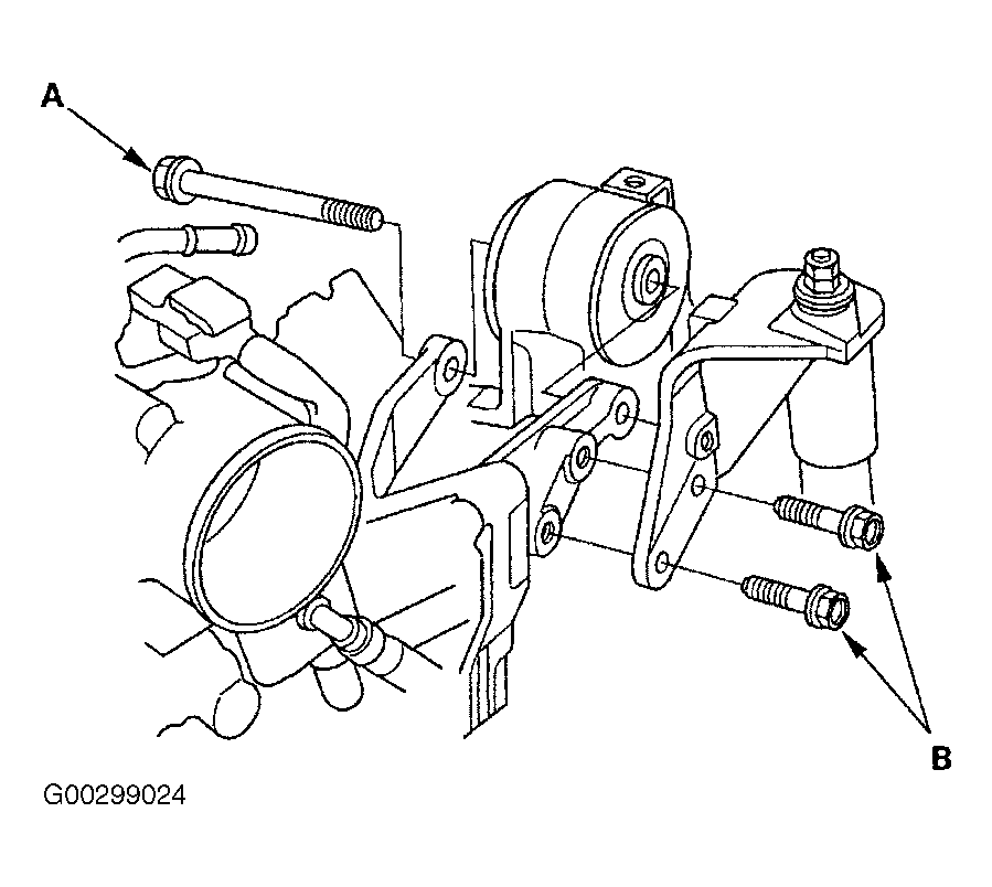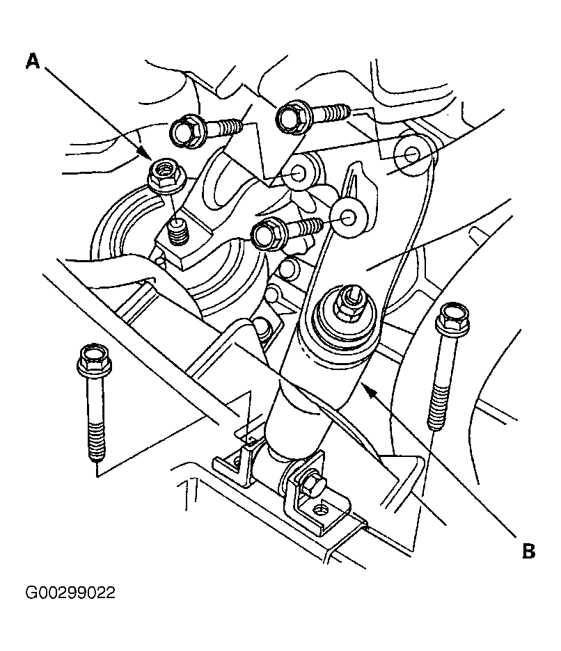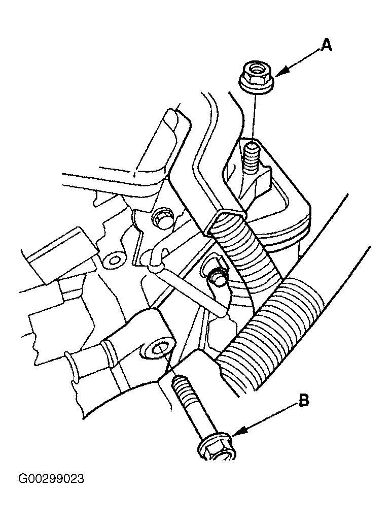 - Tighten the rear mount bracket support nut (A) and mounting bolt (B) (A/T). See Figure. See TORQUE SPECIFICATIONS .
