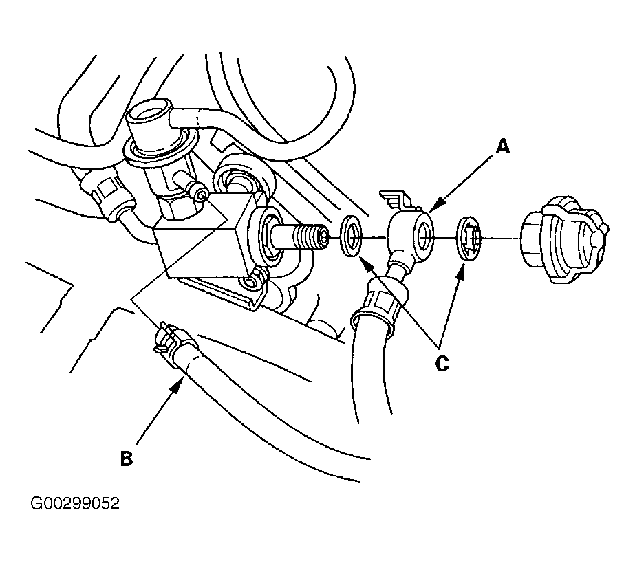 - Install the fuel feed hose (A), using new washers (C). See Figure.