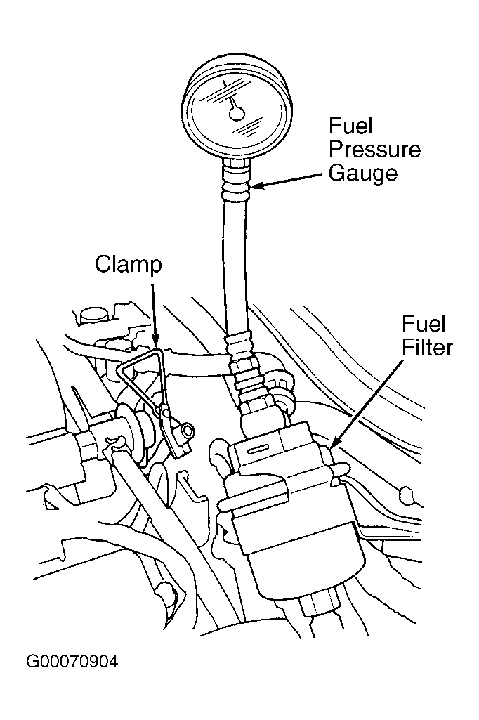 1. Relieve fuel pressure. See FUEL SYSTEM PRESSURE RELEASE  . Connect Fuel Pressure Gauge (07406-0040001) at fuel filter service bolt. See Fig 1 . Reconnect negative battery cable. Start engine and allow to idle. Disconnect and clamp fuel pressure regulator vacuum hose. Observe fuel pressure on gauge. See REGULATED FUEL PRESSURE  table. If vehicle will not start, turn ignition switch on, wait 2 seconds, turn ignition off and then back on and observe fuel pressure.