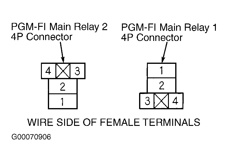 3. Using a voltmeter connected to ground, check for battery voltage at PGM-FI relay No. 2 4-pin harness connector terminal No. 1. With ignition switch still on, if battery voltage is present, go to next step. If battery voltage is not present, repair open in Black/Yellow wire between under-dash fuse/relay box fuse No. 17 and PGM-FI main relay No. 2, 4-pin harness connector. See WIRING DIAGRAMS article. Repair as necessary. Repair as necessary.