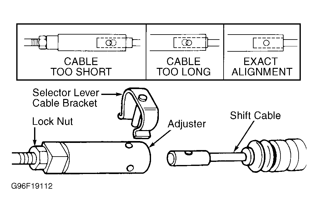 - Remove console, and place gear shift selector into Neutral. Remove selector lever cable bracket from cable adjuster. Align hole in adjuster with hole in shift cable. See Fig 1